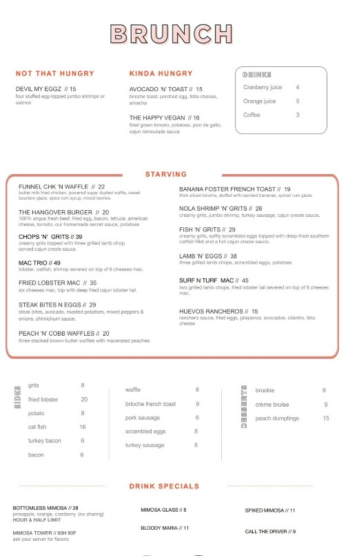 Short: Ambiance is to rave about, food was alright, getting our food was long. Long: Brunch outing with the ladies, and this is where we chose. A colleague told me about it in the past, and I was excited to check it out. Would say the menu options are pretty standard, may seem like a shorter menu in comparison to some other restaurants. Calab was our server and checked in at a good rate. We wanted to try the peach dumplings, but he said they were out. Pictured: Steak bites & eggs, side French toast, Nola shrimp & grits, chopped n grits, fried lobster mac, pineapple mimosa, and brookie. My shrimp and grits were delicious. The person who had the mac said it was more cheese than noodles. The brookie was not the substitute for the dumplings, and we could have just passed on dessert. Can visit again, but overall experience doesn't have me rushing back.